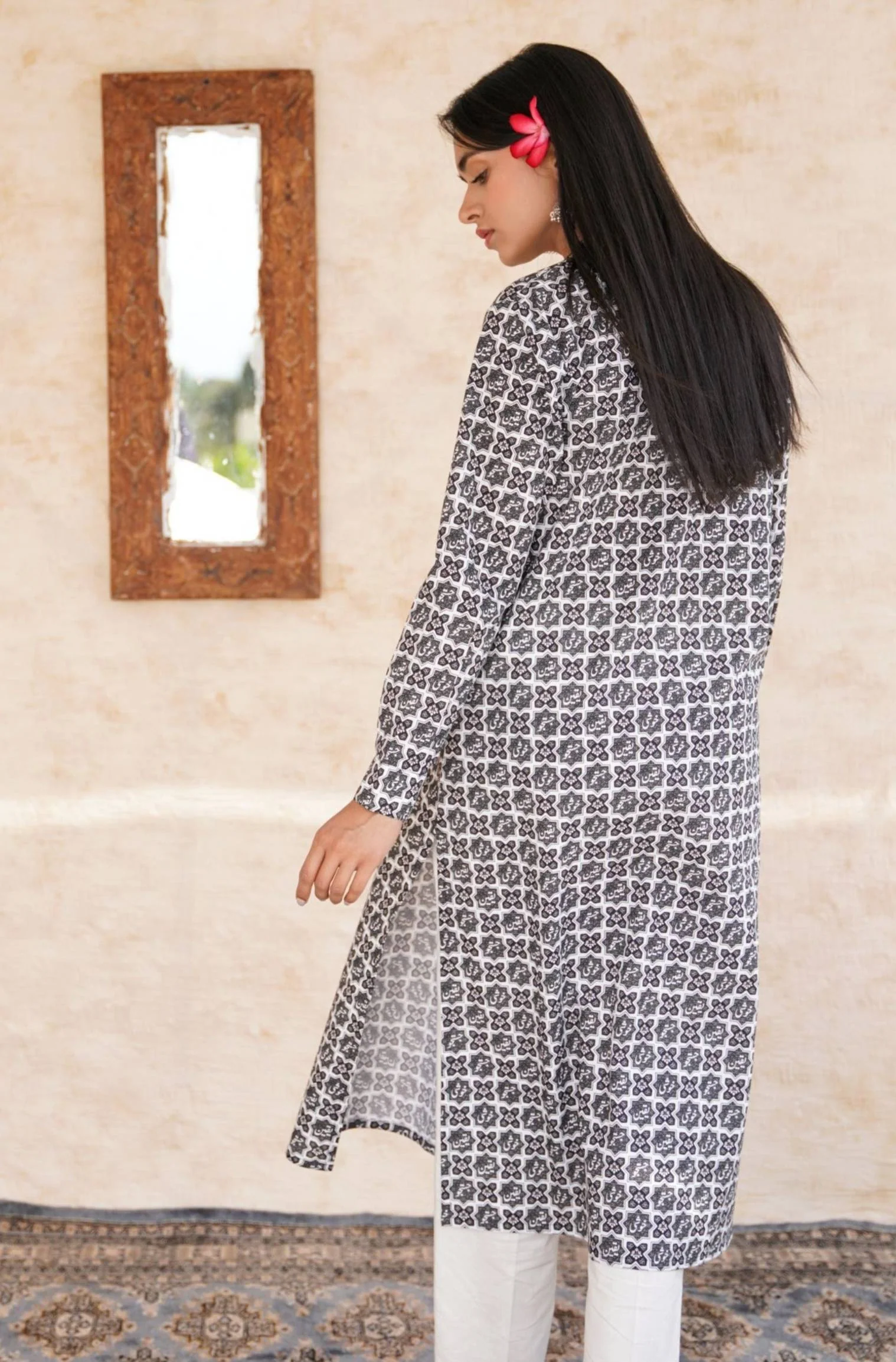 Throughout this kurta is a recurring arrangement of the words یقین (Yaqeen), جستجو (Justuju), and خوشی (Khushi) that serve as a reminder to never give up and keep believing in yourself.